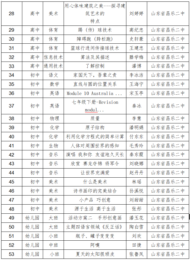 近日,昌乐县公布了 “一师一优课、一课一名师”评选活动获奖名单,在全县评出的284节优课中,我校有53节优课,其中,高中32节,初中16节,幼儿园5节。我校在县优课评选中又一次实现了新的突破。