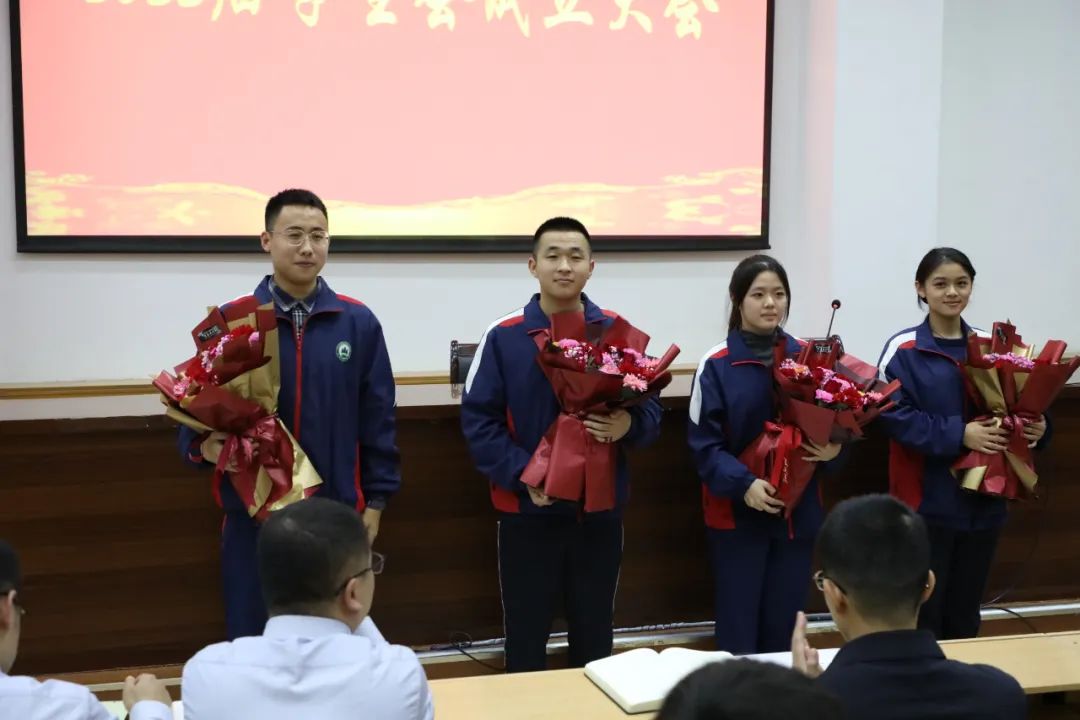期间,冯建会副校长为2022届主席团成员颁发聘书,向他们光荣当选表示祝贺。2022届学生会向2021届学生会主席团献花,表达了感谢。