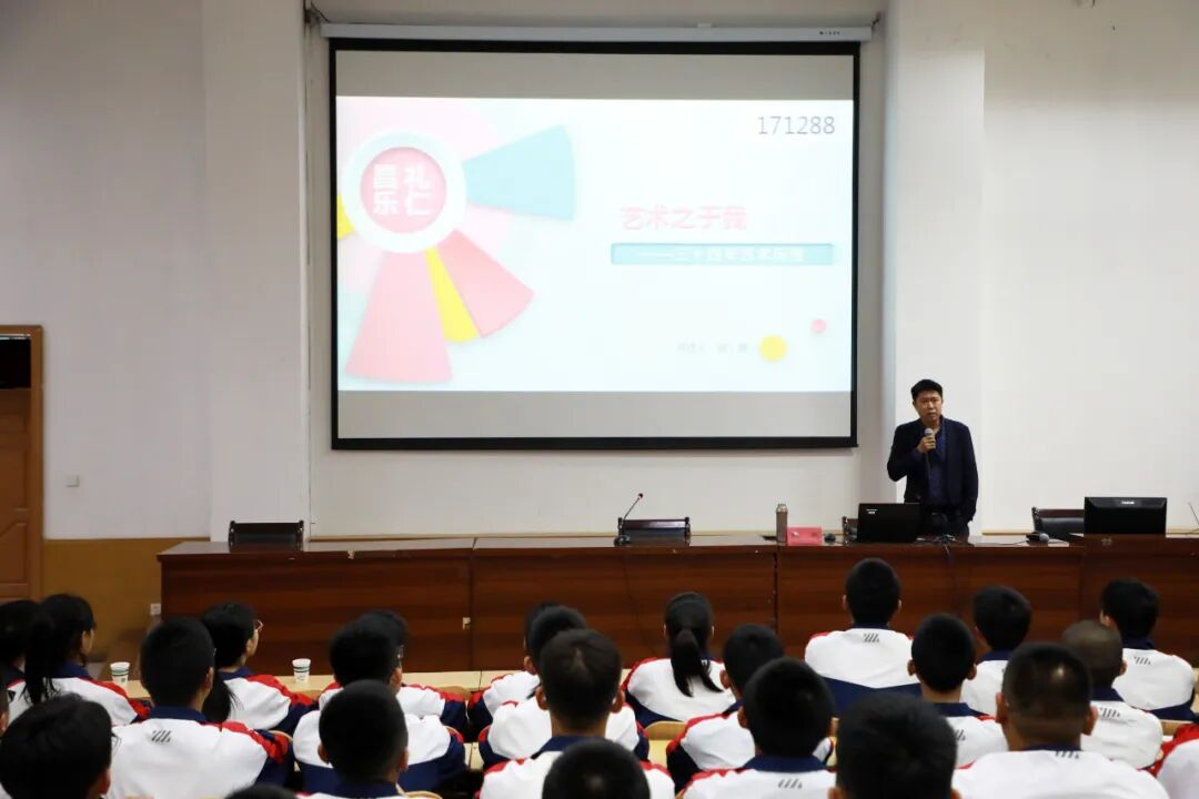 艺术节期间,学校举办了名家进校园活动,邀请山东大学公共文化研究中心副主任、山东大学艺术学院党支部书记赵鹏教授来校为同学们做讲座。讲座中,赵鹏教授向同学们介绍了从事艺术工作三十余年的经历,分享了对艺术的深刻理解和学习艺术的方法。艺术让生活更美好,艺术就在我们身边,赵鹏教授鼓励孩子们要热爱生活,热爱艺术,通过艺术学习不断提升自我的艺术修养,培养真善美的人格情操。