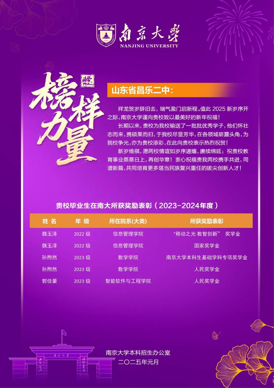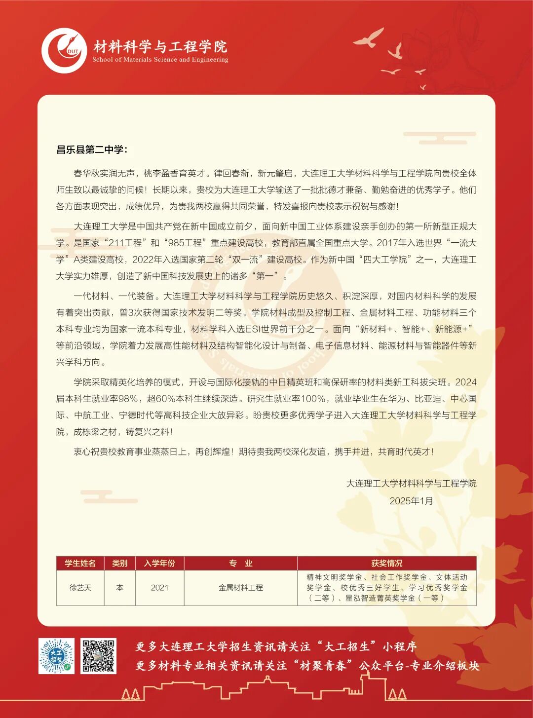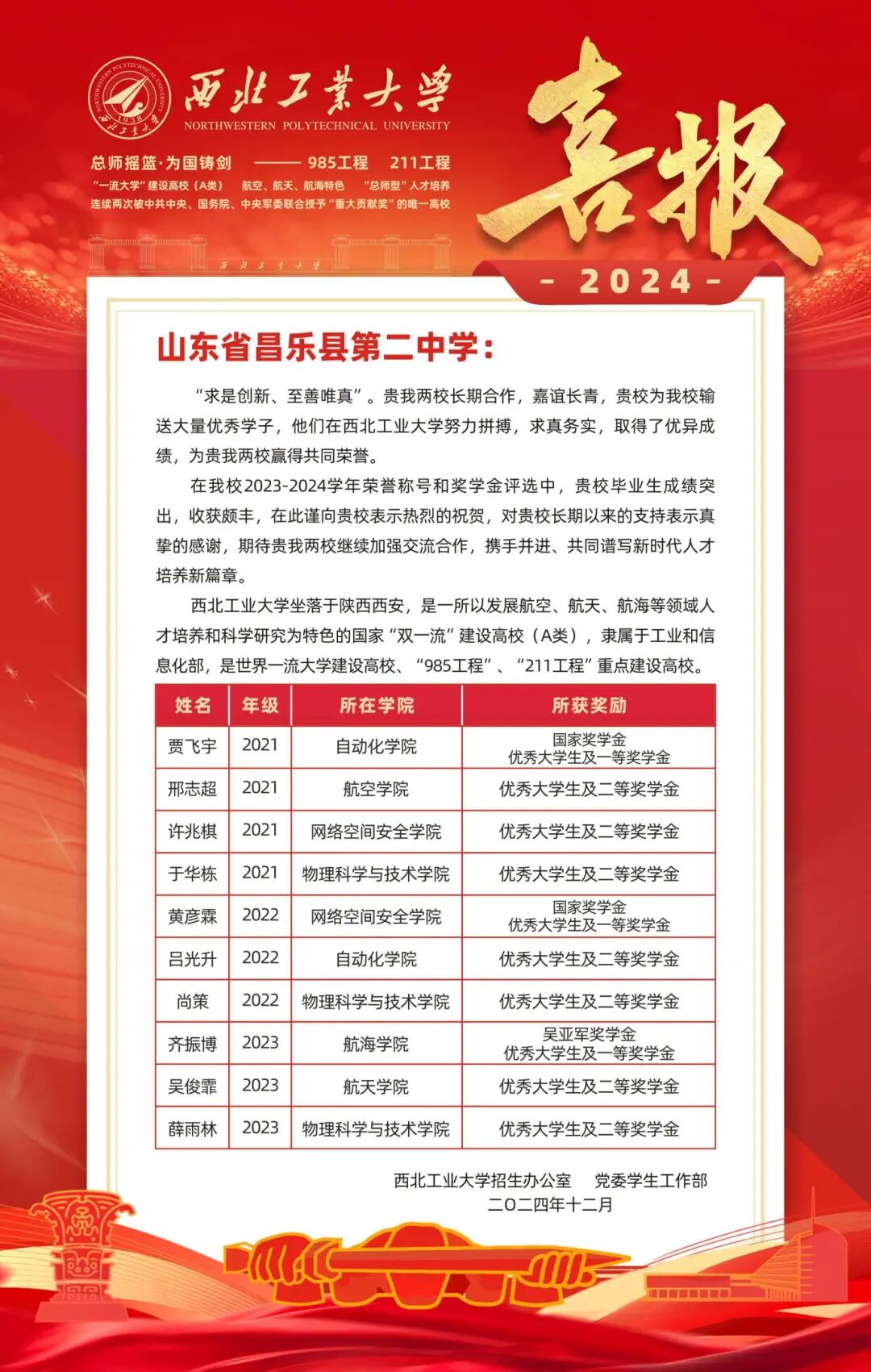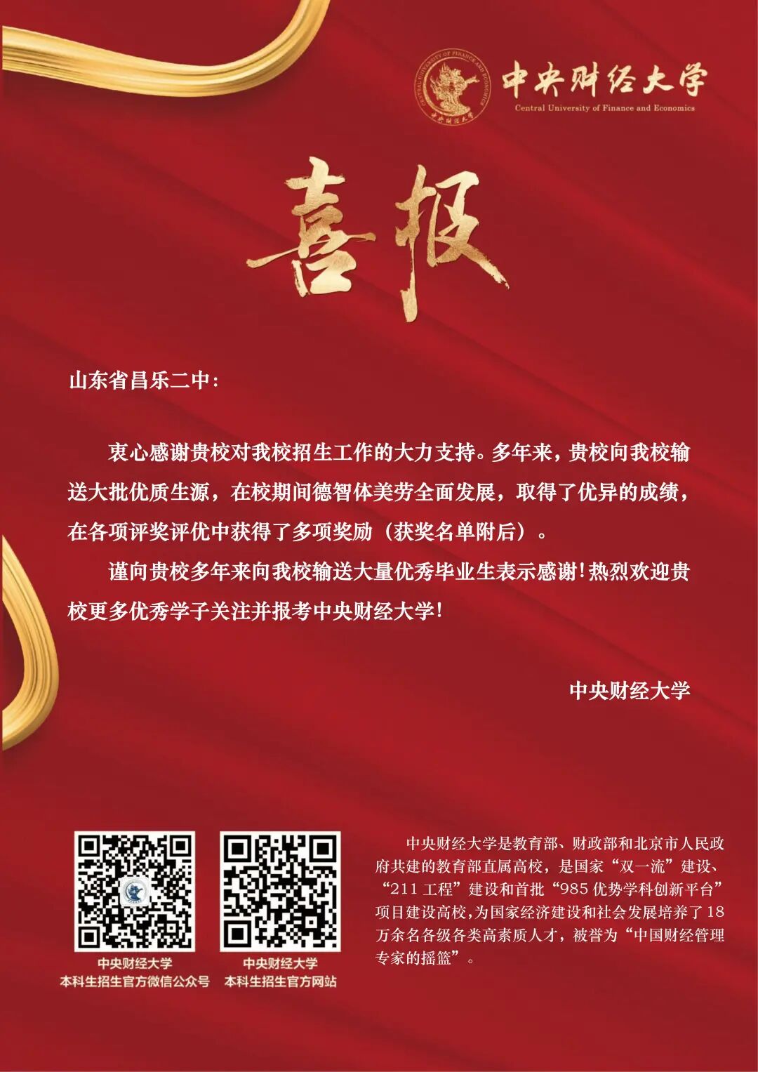 近日,山东大学、南京大学、西北工业大学、大连理工大学、中央财经大学、北京科技大学、兰州大学等多所双一流高校先后向我校发来祝贺,对昌乐二中毕业学子在大学学习期间展现的卓越才能和取得的优异成绩表示热烈祝贺,对我校长期以来取得的优异办学成果给予了高度评价和充分认可,同时表达了与我校携手奋进、深化合作、共育时代英才的期望。