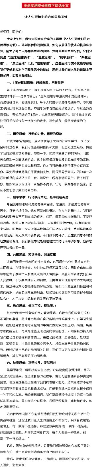 升旗仪式结束后,王进友副校长做了主题为“让人生更精彩的六种思维习惯”的国旗下讲话。