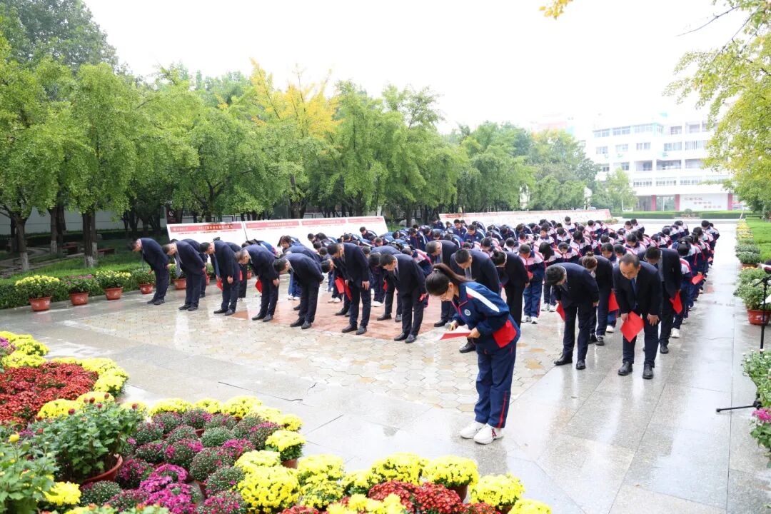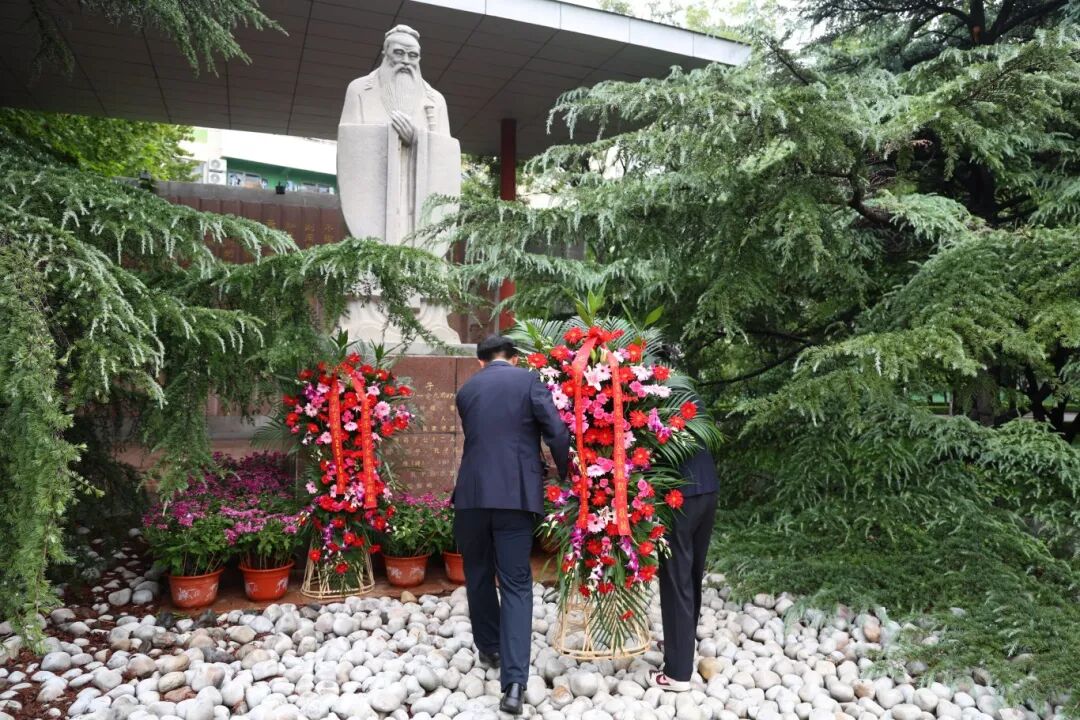 师生代表整齐列队,正冠肃立,伫立在孔子像前。四位师生代表分别向孔子雕像敬献花篮,吕真锋校长走向前整理花篮缎带,全体师生向先师孔子行三鞠躬礼,表达对先师孔子的缅怀与敬仰。