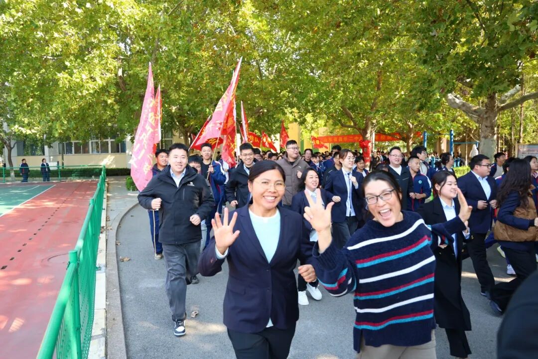 发令枪响,由千余名师生组成的奔跑洪流,应声而动,浩荡而出。他们穿梭在书香四溢的教学楼间,跑过绿草如茵的运动场,途经承载着无数青春记忆的校园地标,每一位师生脸上都洋溢着自豪与喜悦,铿锵有力的脚步声与嘹亮的口号声交织在一起,奏响了献给母校66岁生日最动听的乐章。