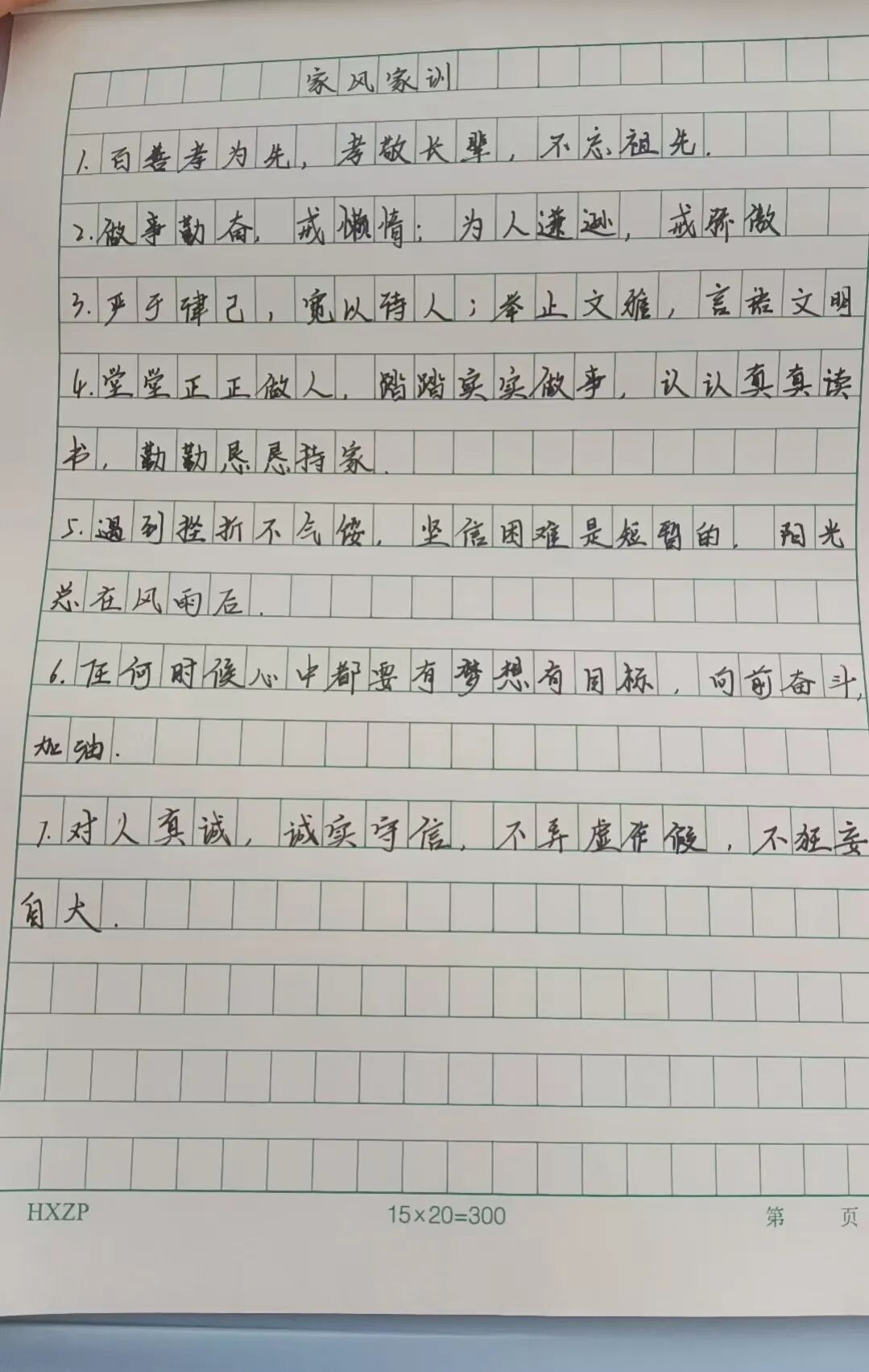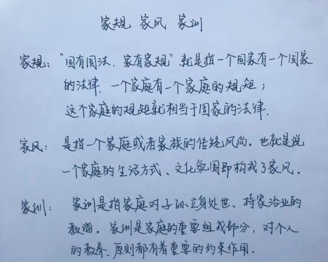 家庭文化是孩子生命成长最重要的环境。家庭成员关系和睦、积极向上,人人承担责任是一个孩子健康成长的必须。学生组织召开家庭会议,人人参与,明确家训、家规,并张贴在家里显眼的地方;人人有承担家庭责任的机会、权力和体验,家长以身立教,孩子积极成长。